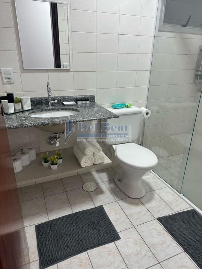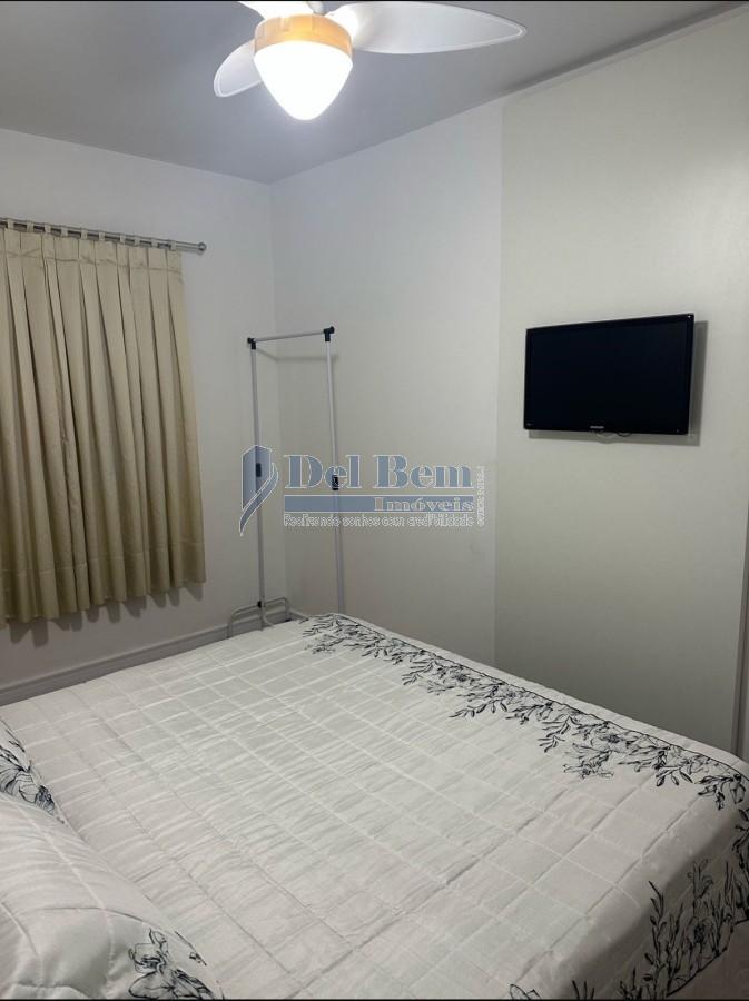 Apartamento com 72 metros quadrados, contendo 2 dormitórios no piso laminado com camas e guarda-roupas, 1 banheiro, cozinha com geladeira, fogão e armários, sala no piso laminado com mesa de jantar, sofá, TV e varanda, área de serviço e 1 vaga de garagem coberta.